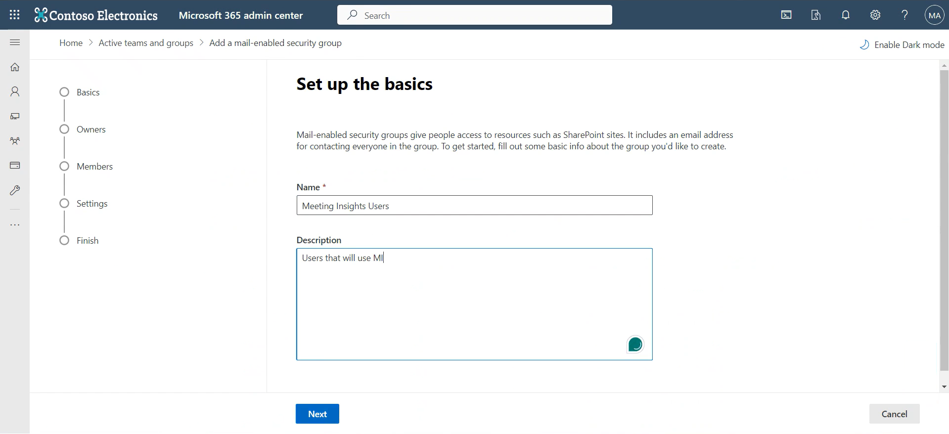 | 3. | In the 'Set up the basics' page shown above, enter Meeting Insights Users in the 'Name' field, enter a 'Description' to facilitate effective management later, and then click Next. |
