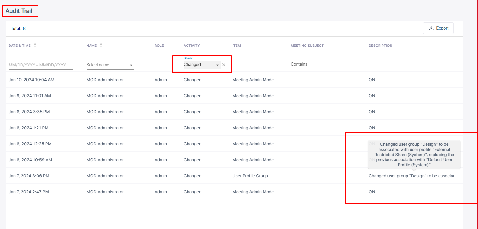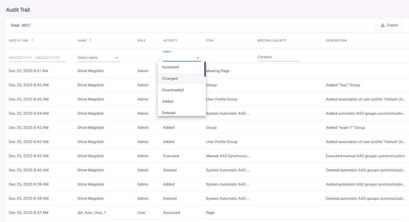 Meeting Insights features an 'Audit Trail' which logs for future reference admin and user activities performed in Meeting Insights.