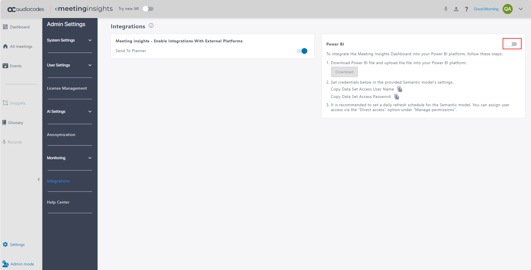 The instructions below show admin how to enable Power BI integration in Meeting Insights.