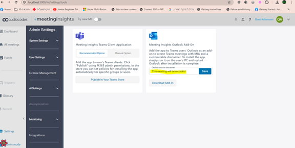 The Tools page enables admin to add the Meeting Insights app to Teams users’ Outlook as an add-on to create Teams meetings with MIA. The instructions below show how to set up the Microsoft Outlook add-in.