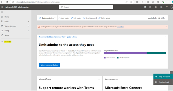 | 3. | Log in to https://admin.microsoft.com/ to view the Microsoft 365 admin center. |