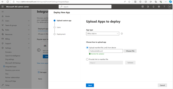 | 7. | From the 'App type' drop-down, select Office Add-in, select the Upload manifest (.xml) from device option and then click Choose File. Click Next after xml validation. |
