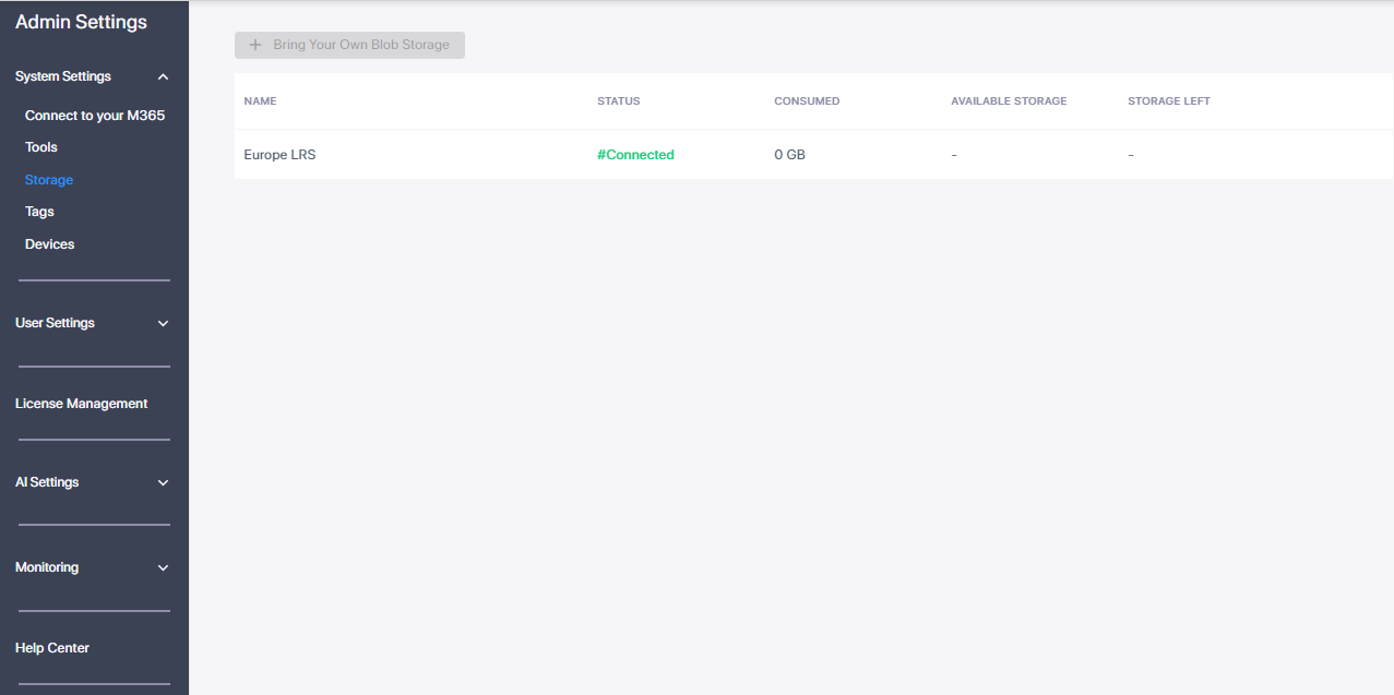 | ■ | Under the ‘System Settings’ menu, click the Storage option; the default storage account is displayed (e.g., Europe LRS). |