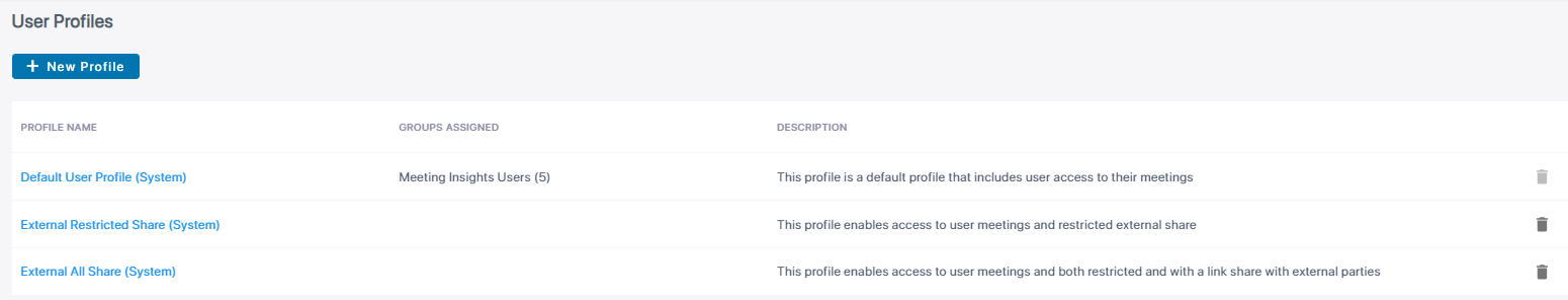 Only users assigned with a license are able to access Meeting Insights or record meetings according to their profile. The remaining users who don't have a license but participated in a meeting will not have access to Meeting Insights. Meeting Insights caches their info to present them in the meeting info. To use Meeting Insights, a user must be connected to at least one user profile. Three user profiles are provided with Meeting Insights. Admin can create more.