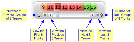 2. Select the trunk that you want to configure, by clicking the desired Trunk number icon. The bar initially displays the first eight trunk number icons (i.e., trunks 1 through 8), if they exist. To scroll through the trunk number icons (i.e., view the next/last or previous/first group of eight trunks), see the figure below. If the scroll bar displays all available trunks, the scroll bar buttons are unavailable.