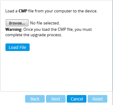At this stage, you can quit the Software Upgrade wizard without having to reset the device, by clicking Cancel. However, if you continue with the wizard and start loading the .cmp file, the upgrade process must be completed with a device reset. |
