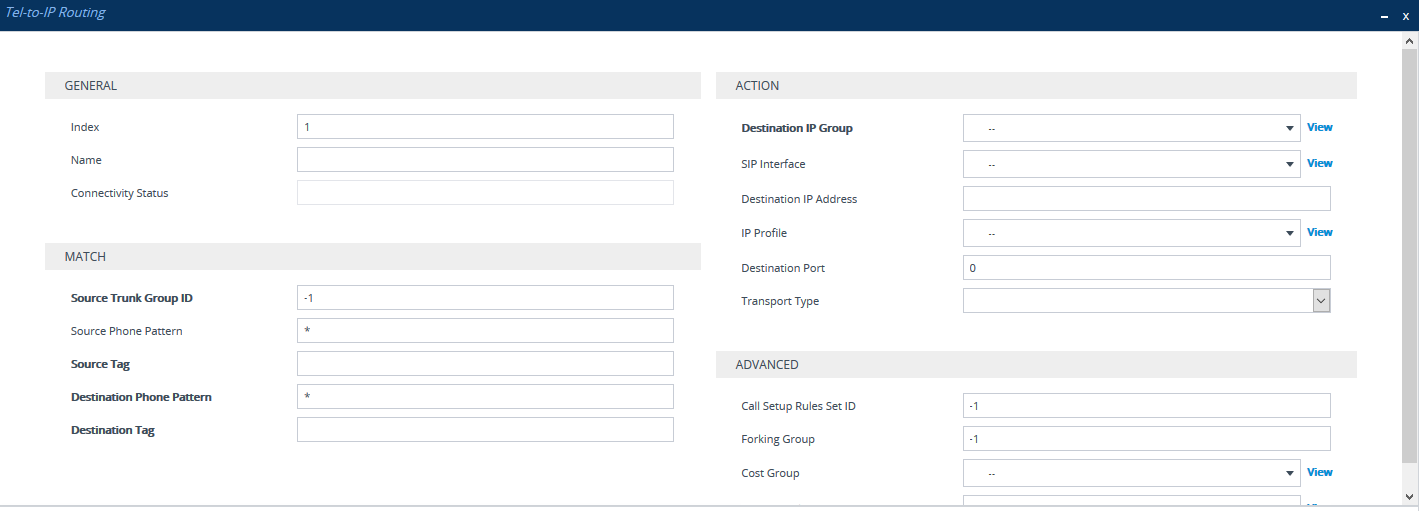 The following procedure describes how to configure Tel-to-IP routing rules through the Web interface. You can also configure it through ini file [Prefix] or CLI (configure voip > gateway routing tel2ip-routing).