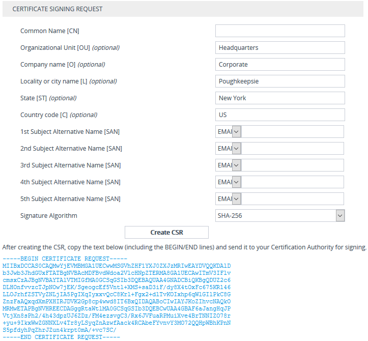 If you want to generate a CSR for SAN (with multiple subject alternate names), then from the 'Subject Alternative Name [SAN]' drop-down list, select the type of SAN (e-mail address, DNS hostname, URI, or IP address), and then enter the relevant value. You can configure multiple SAN names, using the 1st to 5th 'Subject Alternative Name [SAN]' fields. |