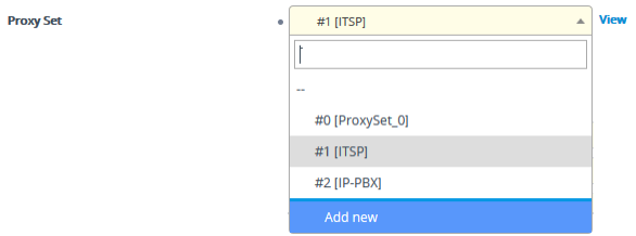 Some tables contain parameters whose value is an assigned row (referenced-row) from another table (referenced-table). For example, the IP Groups table contains the 'Proxy Set' parameter whose value is an assigned Proxy Set, configured in the Proxy Sets table. These parameter types provide a drop-down list for selecting the value and a View button, as shown in the example below: