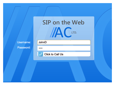 WebRTC is a browser-based real-time communication protocol. WebRTC is an open source, client-side API definition (based on JavaScript) drafted by the World Wide Web Consortium (W3C) that supports browser-to-browser applications for voice calling (video chat, and P2P file sharing) without plugins. Currently, the device's WebRTC feature is supported only by Mozilla Firefox and Google Chrome Web browsers other browsers are still not fully compatible with WebRTC). Though the WebRTC standard has obvious implications for changing the nature of peer-to-peer communication, it is also an ideal solution for customer-care solutions to allow direct access to the contact center. An example of a WebRTC application is a click-to-call button on a consumer Web site (see following figure). After clicking the button, the customer can start a voice and/or video call with a customer service personnel directly from the browser without having to download any additional software plugins. The figure below displays an example of a click-to-call application from a customer Web page, where the client needs to enter credentials (username and password) before placing the call.