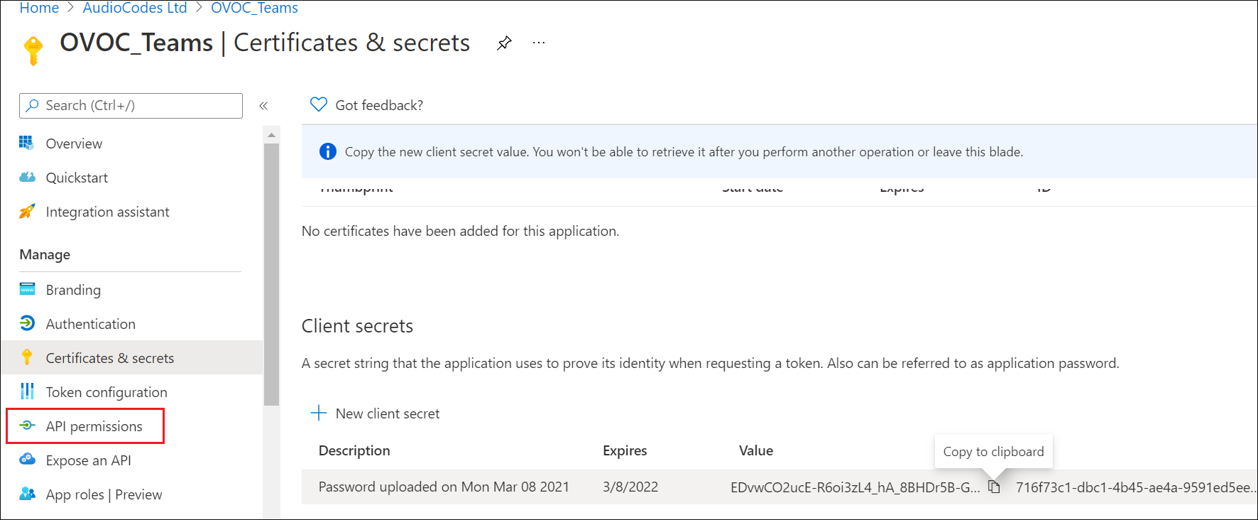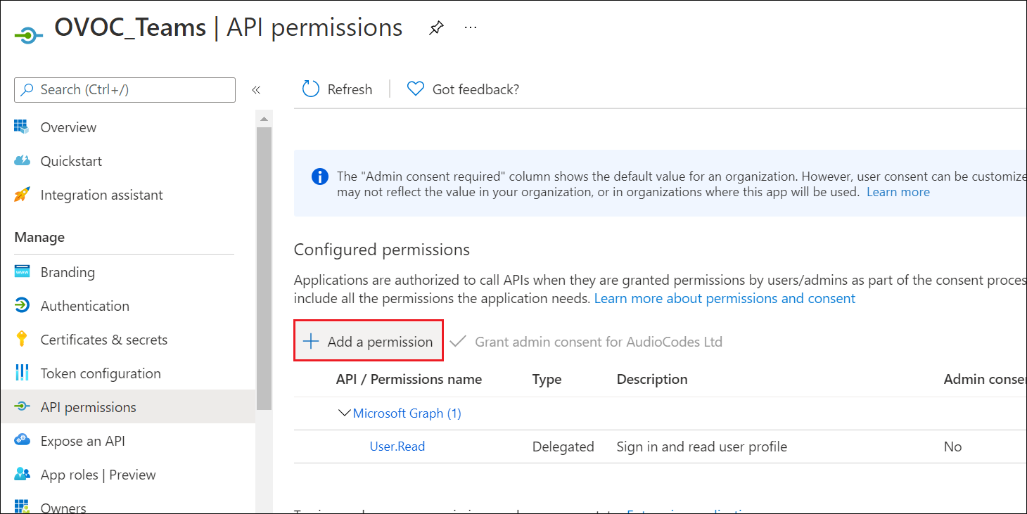 This procedure describes how to configure the appropriate permissions to connect to Microsoft Graph API that is used to interface with Microsoft Teams to retrieve the Call Notifications.