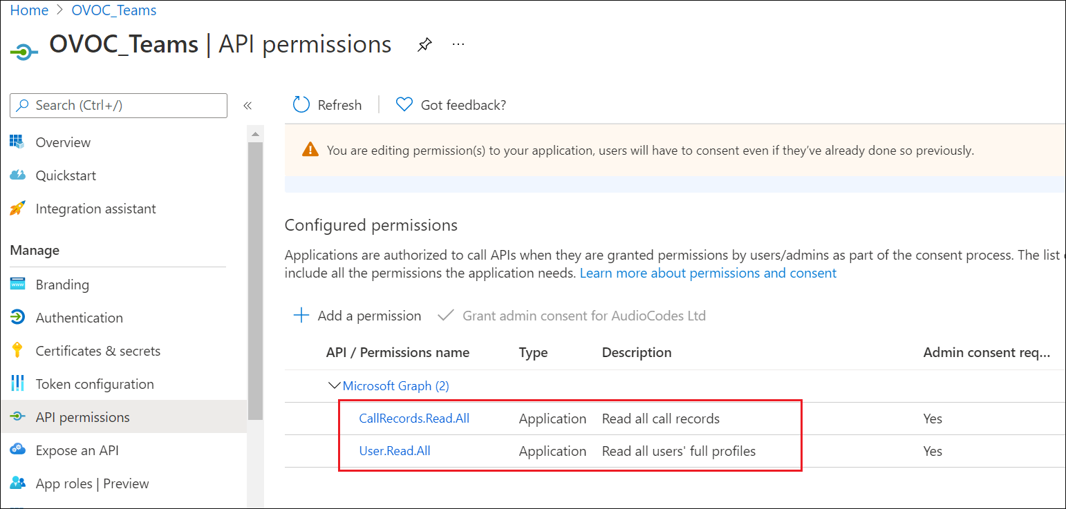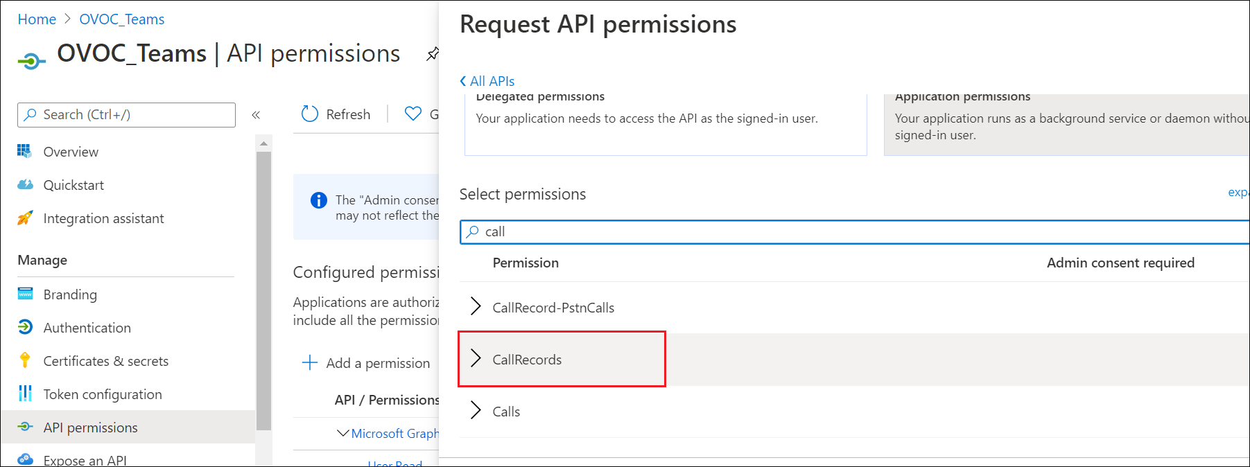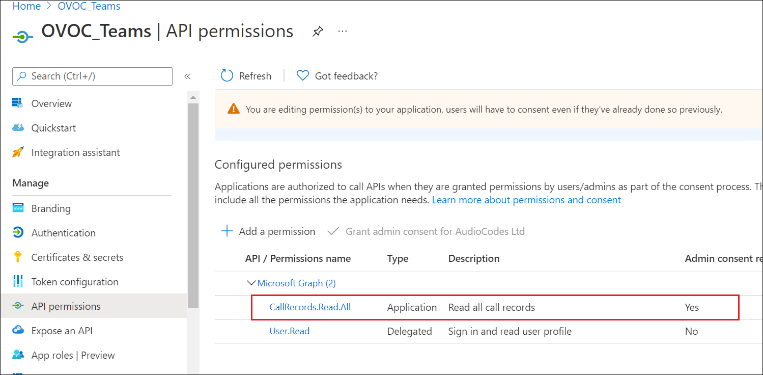 7. Set permission CallRecords.Read.All to enable access to retrieved call notifications.
