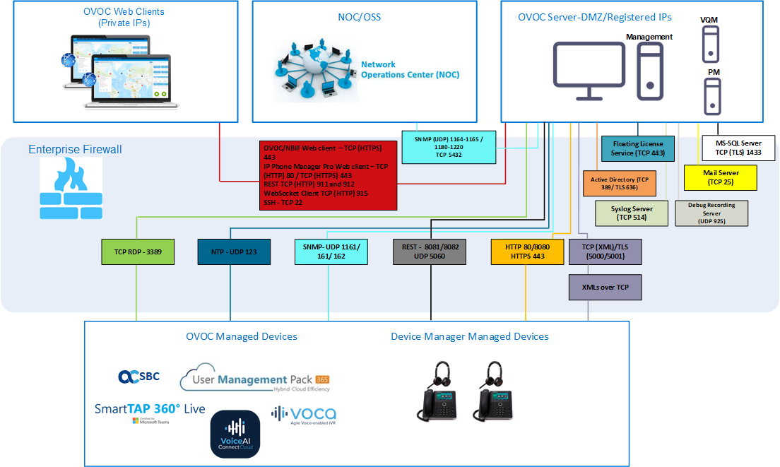 The OVOC interoperates with firewalls, protecting against unauthorized access by crackers and hackers, thereby securing regular communications. You need to define firewall rules to secure communications for the OVOC client-server processes. Each of these processes use different communication ports. By default, all ports are open on the OVOC server side. When installing the OVOC server, you need to configure its network and open the ports in your Enterprise LAN according to your site requirements; based on the firewall configuration rules (representing these port connections) that are described in the table and figure below.