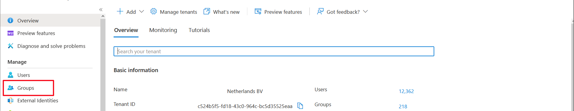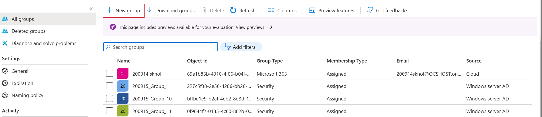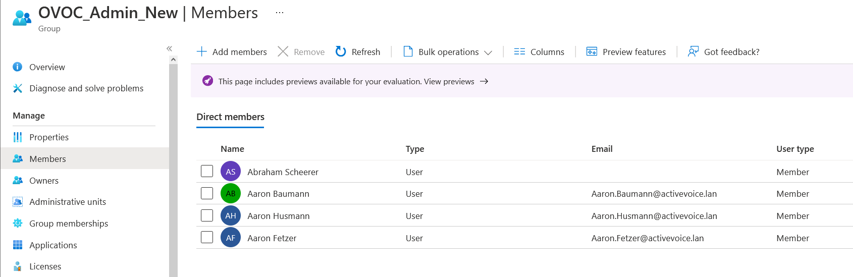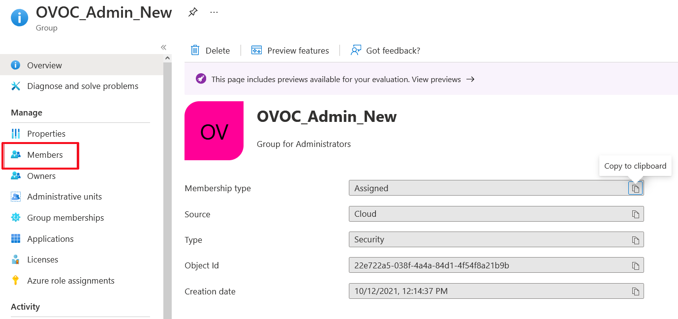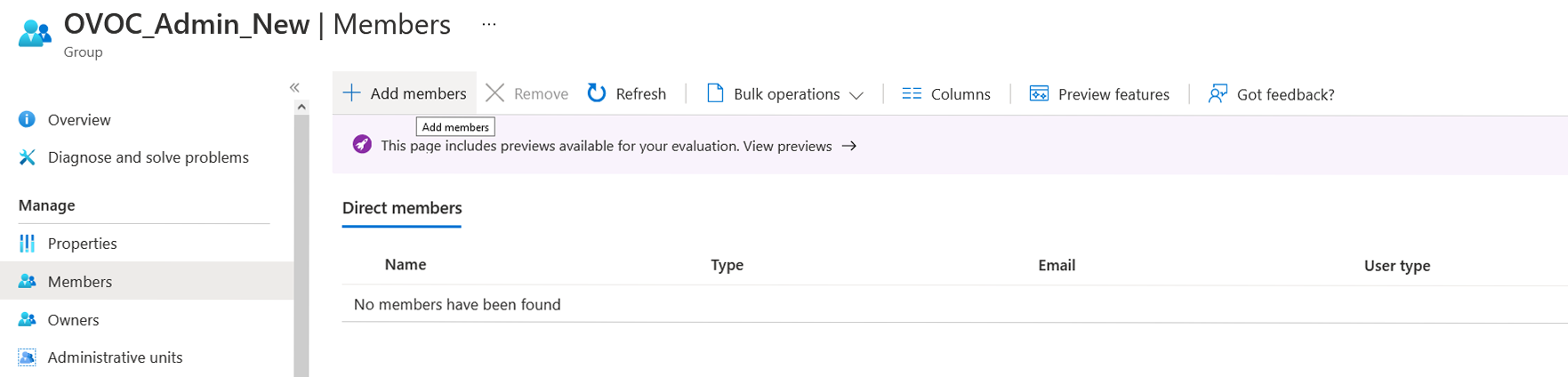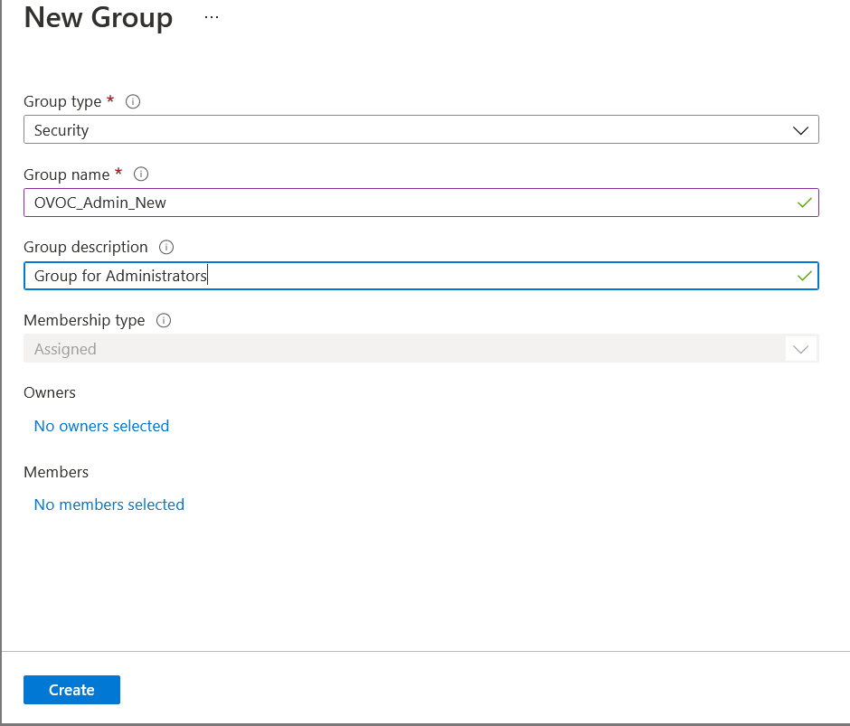 This section describes how to create groups on Azure and assign them member operators. You should define a separate group for each required security level. These group names are configured in OVOC Azure Authentication Settings screen from where they are mapped to the relevant security level; see the list of security groups that are defined below. Identical group names must be configured on Azure. For example, for System Administrator User Group Name, configure "OVOC_Admin" string in OVOC and as the group name on Azure.