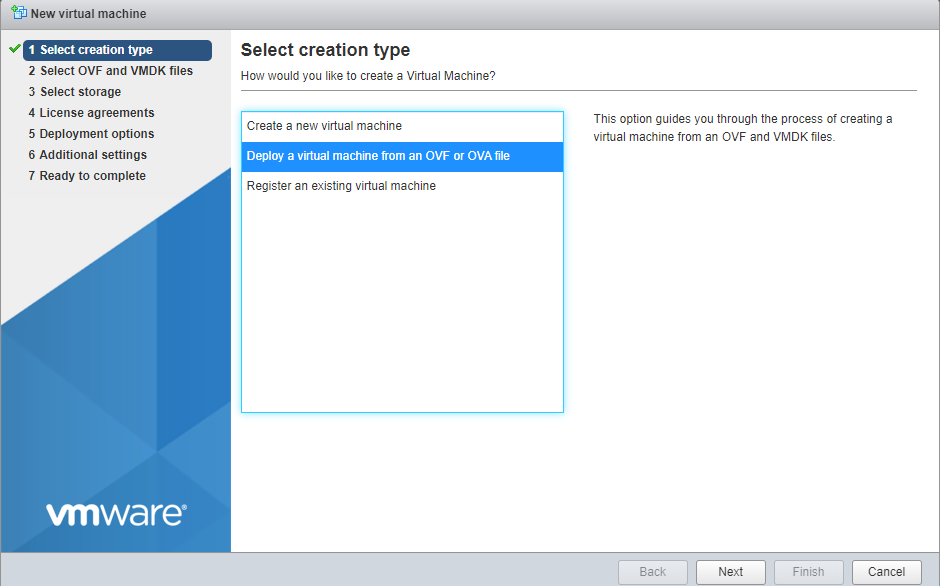 | 4. | Select option Deploy a virtual machine from an OVF or OVA file and then click Next. |
