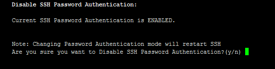| 2. | Type y to disable SSH password authentication or n to enable, and then press Enter. |