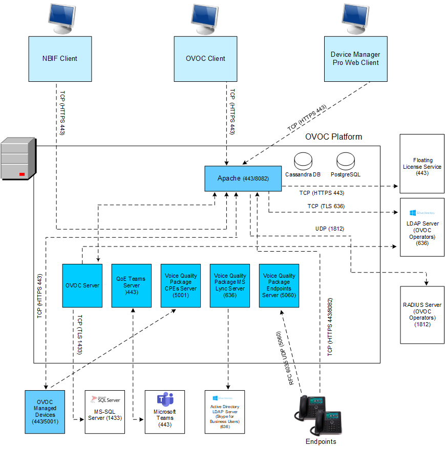 The above figure shows all the HTTPS/SSL/TLS connections in the OVOC network. Use this figure as an overview to the procedures described below. Note that not all of the connections shown in the above figure have corresponding procedures. For more information, refer to the OVOC Security Guidelines document. |