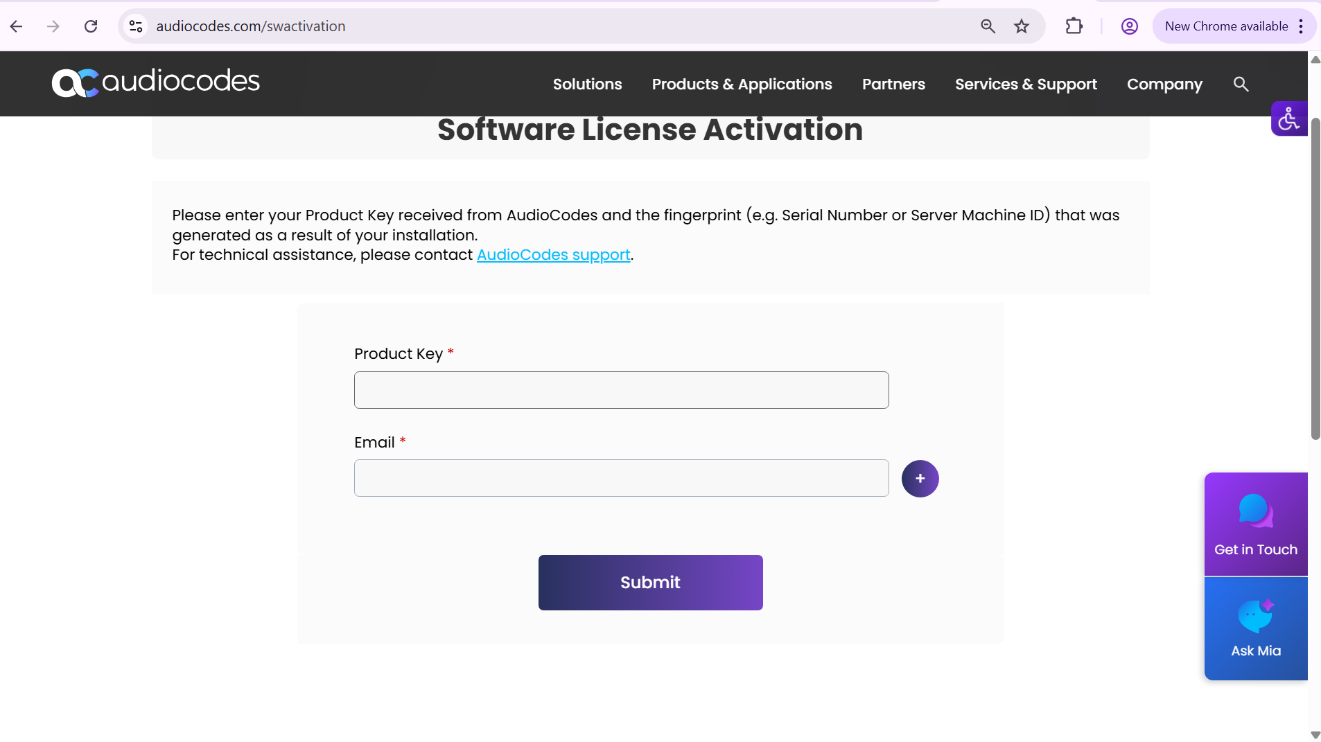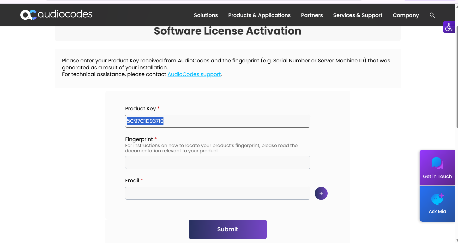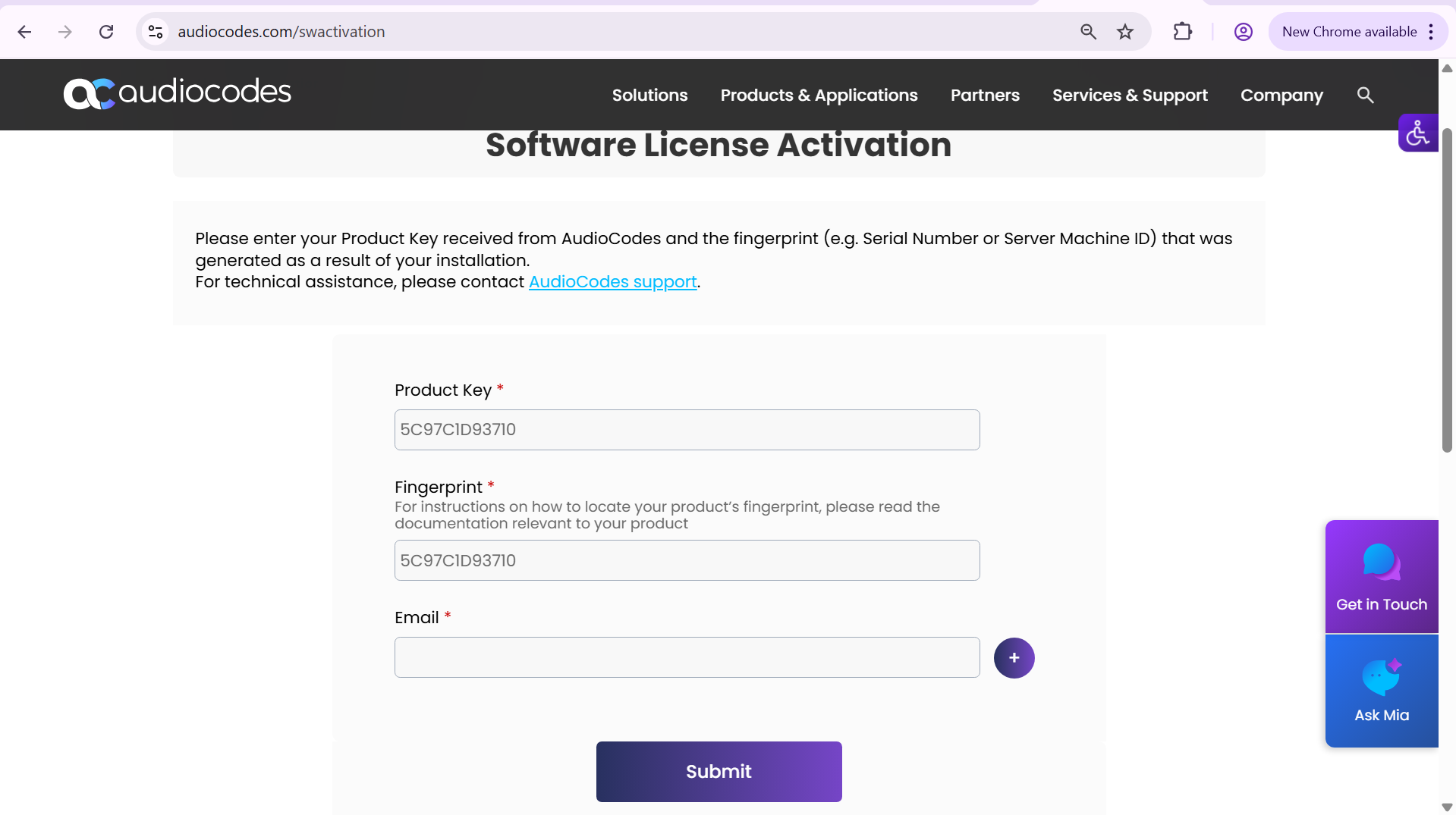 | 6. | In the Email field, enter the email address of your AudioCodes support representative, and then click Submit. |