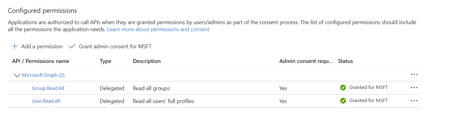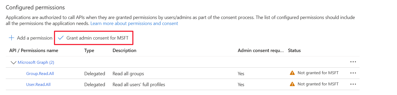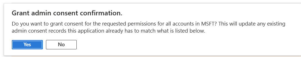 Click Grant admin consent for <Tenant_Name> link to grant consent for the requested permissions for all accounts for this tenant, and then click Yes to confirm. |