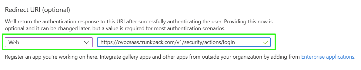 Enter the HTTPS Redirect URI (REST endpoint) for connecting to OVOC Web in the following format: https://ovocsaas.trunkpack.com/v1/security/actions/login |
