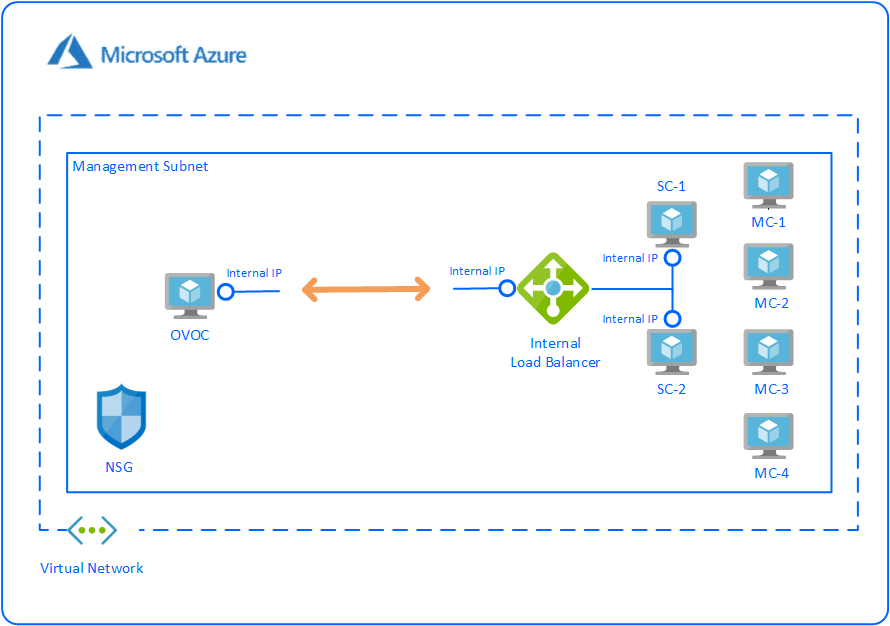 This section describes how to establish a secure connection between the OVOC server and Mediant CE devices which are both deployed in the Azure Cloud in the same Virtual network. Communication between OVOC and Mediant CE SBC devices is carried over internal IP addresses (Private IP addresses) on both sides. The figure below illustrates this topology.
