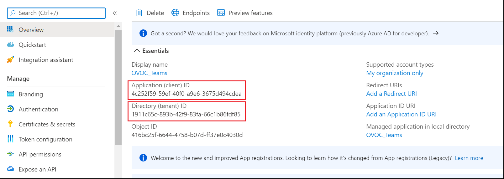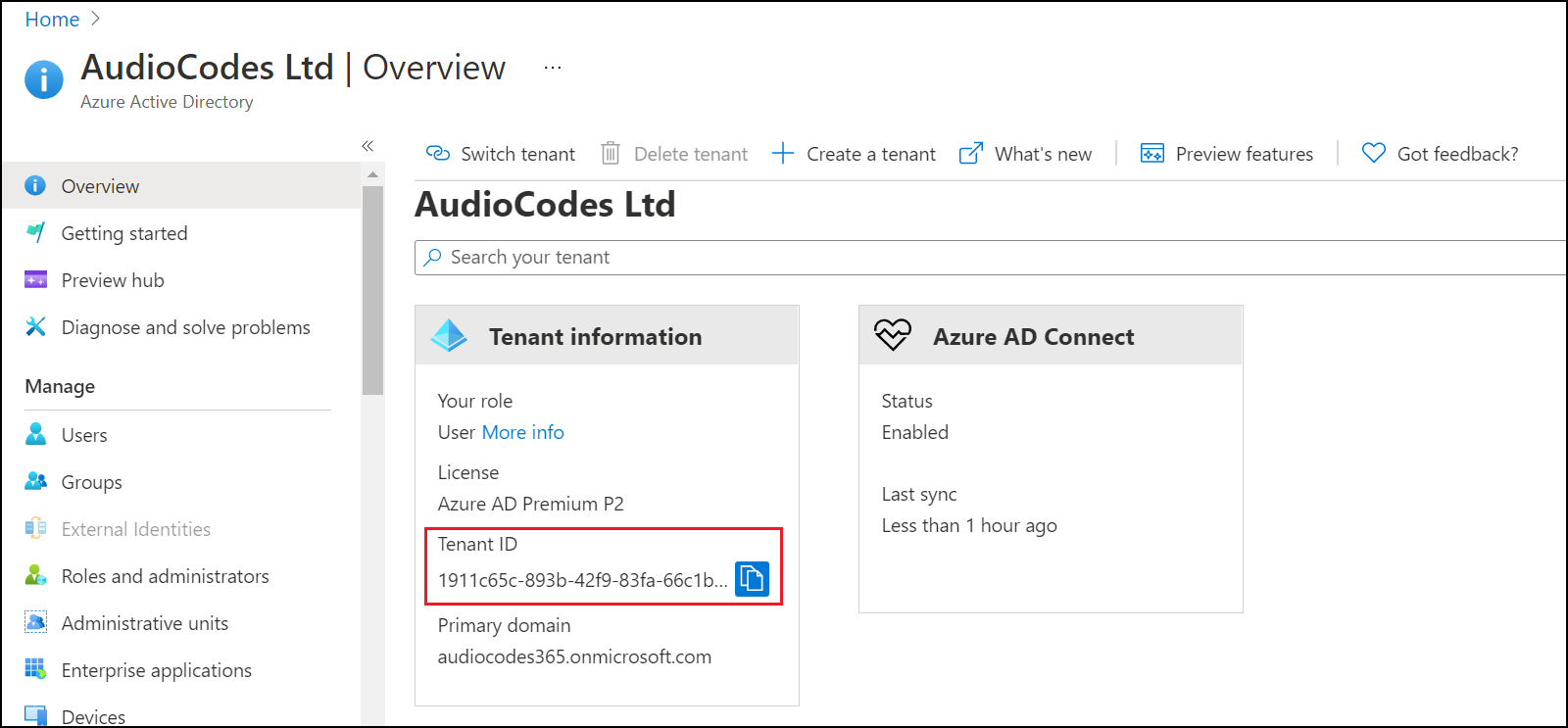 | 1. | Open the Azure Portal, the Overview page is displayed with the Tenant ID of the managed Teams tenant. |
