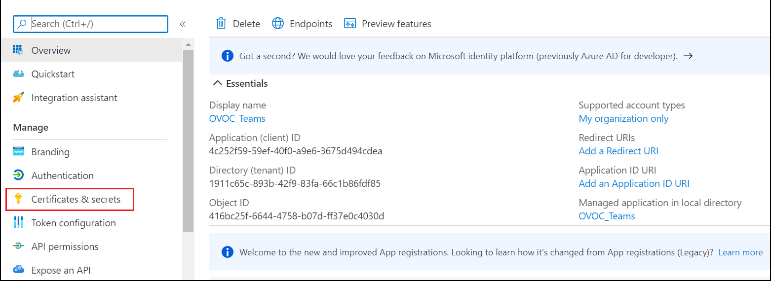 | 5. | In the Navigation pane select Certificate & Secrets. |
