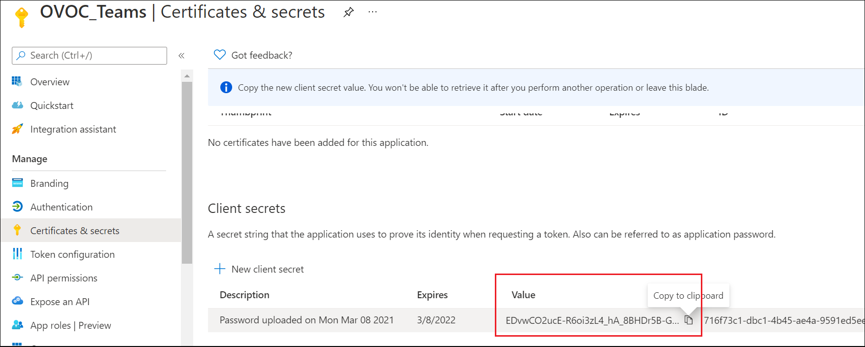 | 8. | The client secret is added as shown in the screen below. Copy it to the clipboard as you will be required to enter it in later configuration. |
