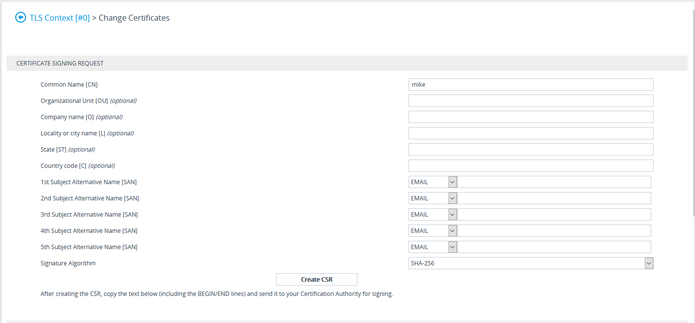 In the table, select the TLS Context Index #0, and then click the TLS Context Certificate button, located below the table; the Context Certificates page appears. |