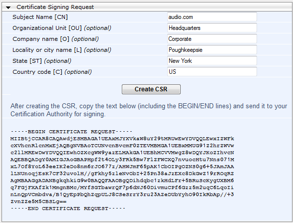c. Click the Create CSR button; a textual certificate signing request is displayed in the area below the button: