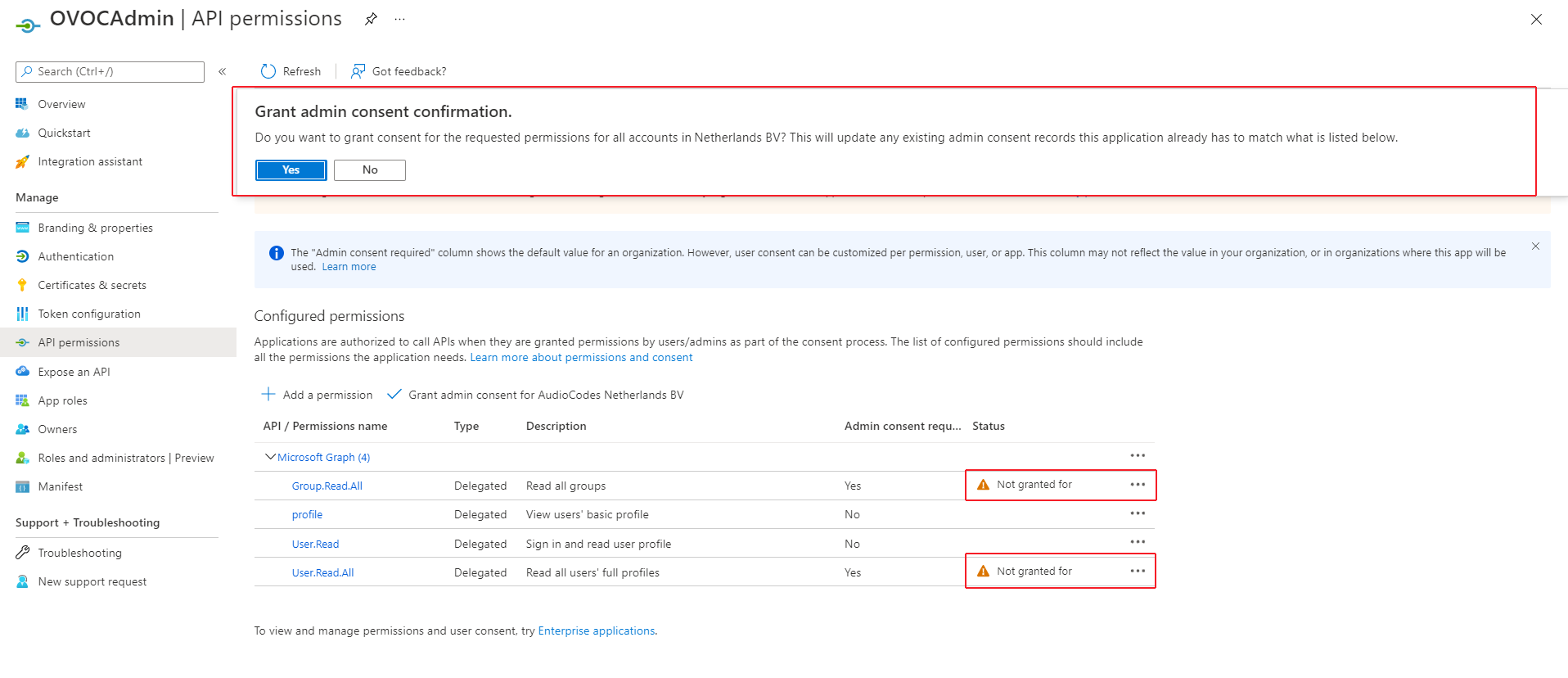 | 13. | Click Grant admin consent for <Tenant_Name> link to grant consent for the requested permissions for all accounts for this tenant, and then click Yes to confirm. |