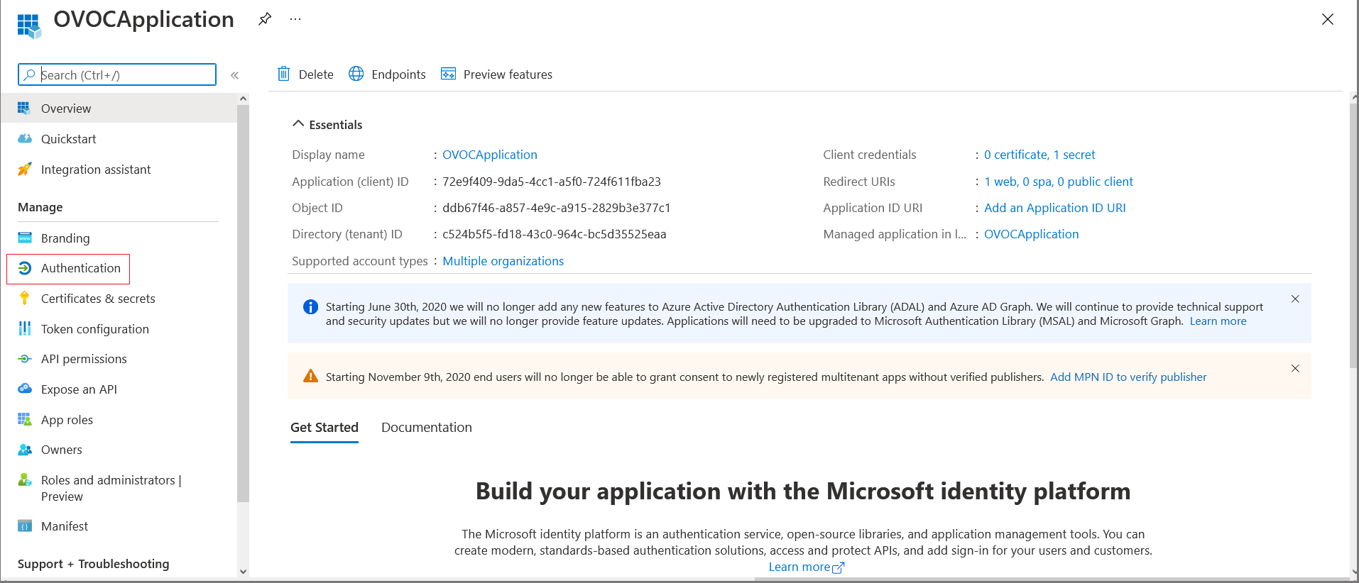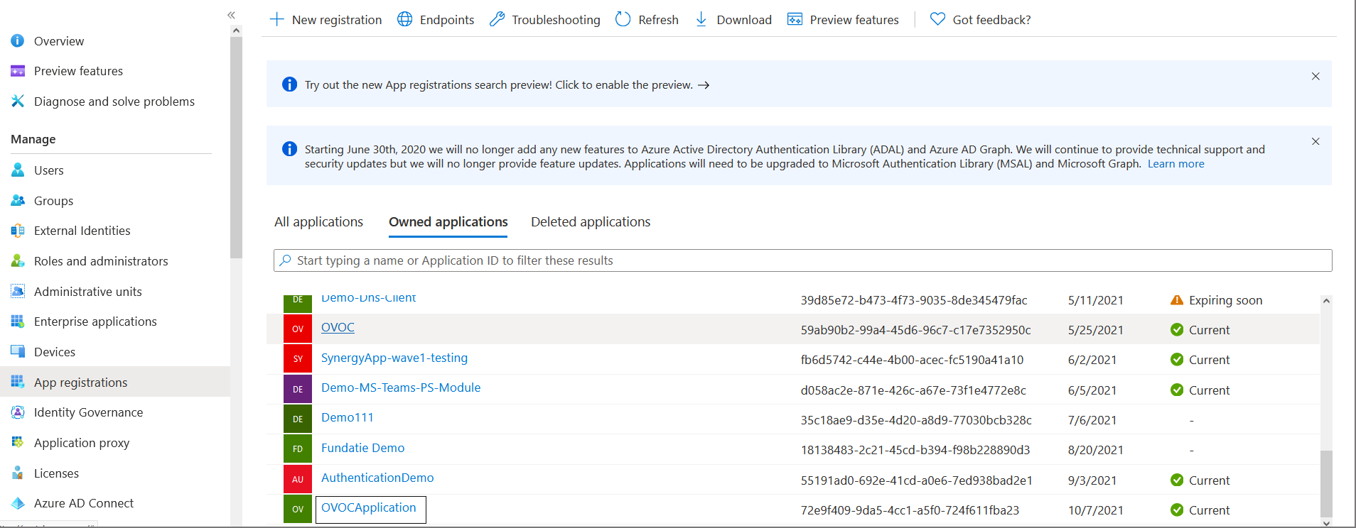 | 2. | In the Navigation pane, select App registrations and select the registered OVOC application (the example used in this section "OVOCApplication" is selected below). |