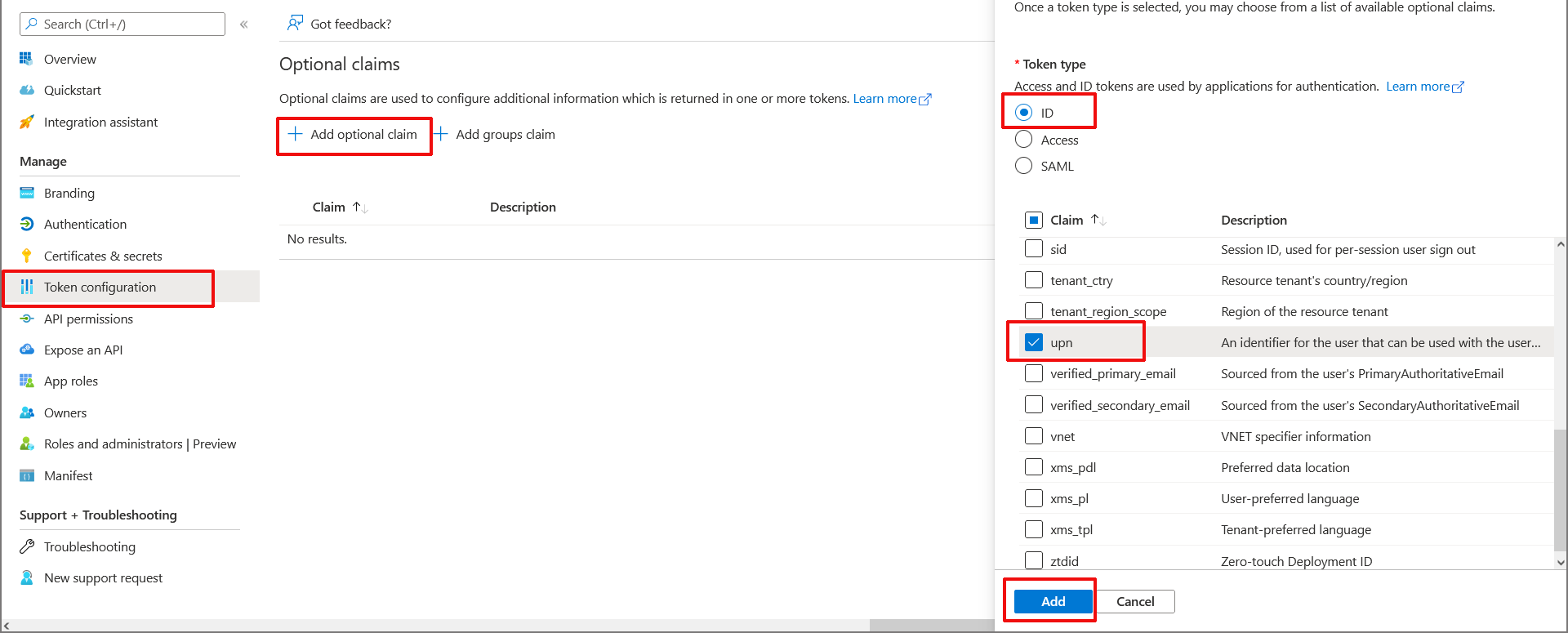| 6. | Click Add optional claim, choose ID type then upn optional claim and click Add to confirm. |
