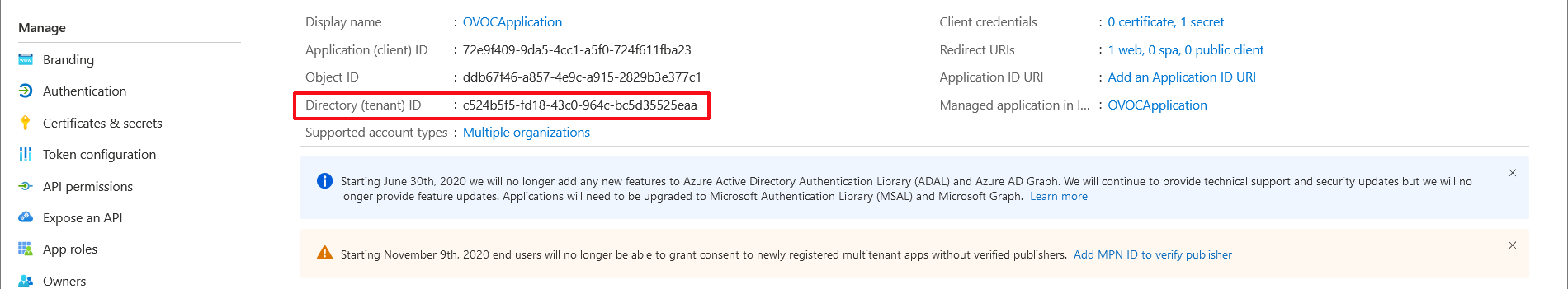 | 19. | Note the Directory (tenant) ID value as it must later be configured inConfiguring OVOC Web Azure Settings - Multitenant Upgrade |
