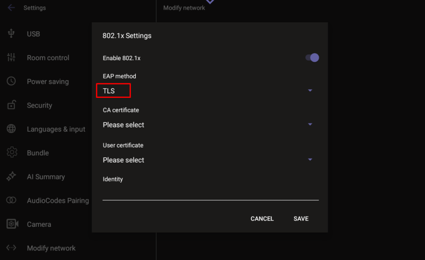 | 3. | Once 802.1x is enabled, choose the security method and strength. A commonly used option is EAP-TLS. |