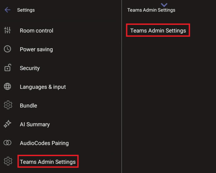 If you access Settings by tapping More on the RX-PAD homepage and then tapping Settings > Device Settings, the ‘Teams Admin Settings’ option will appear in the Settings sidebar menu. |