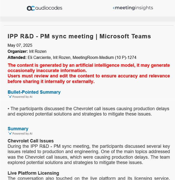 A couple of minutes after the meeting has ended, the AI Summary mail is sent to the recipients.