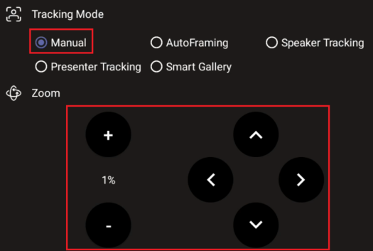 To manually set a camera’s zoom-in and PTZ, set its Tracking Mode to Manual. Use the + and - signs to zoom in and out, and the arrows to set its PTZ.