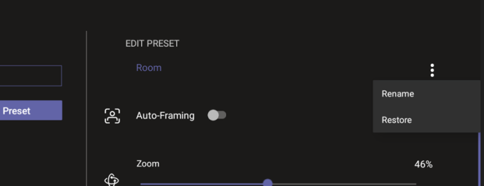 If you configure a preset (for example) to zoom in and focus on a whiteboard in the meeting room, users in a video call-meeting can switch to it and later switch back to the default ‘Room’ preset or any other defined preset. |