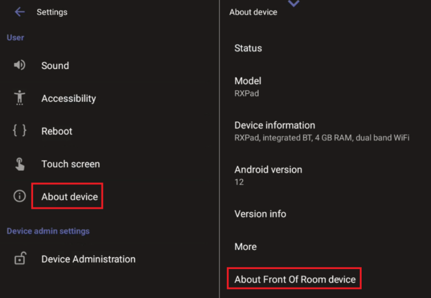 If you are accessing the page from the RX-PAD, the RX-PAD device information is displayed. To view the RXV device info, tap About Front of Room device.