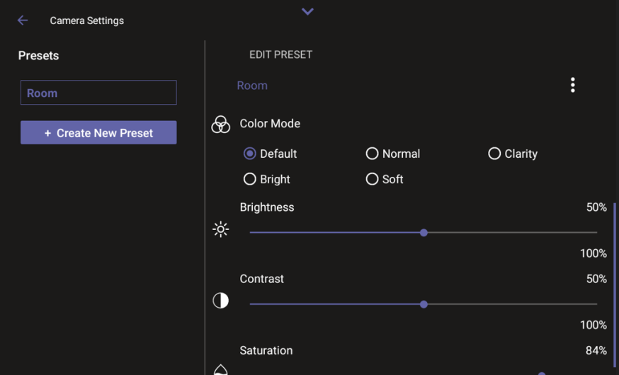 To permanently configure the default Room preset or create permanent presets, you need to be logged in as admin (see Access Device Admin Settings).