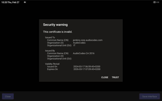 Some third-party Room Control systems use certificates that are either self-signed or not issued by a well-known Certificate Authority (CA). If the connected Room Control system presents a non-standard certificate, a prompt is displayed asking you if you want to trust this certificate. You have the option to manually trust these certificates during setup. However, it's important to understand that doing so involves accepting potential security risk. As a certificate's authenticity cannot be verified through standard procedures, you should exercise caution and be aware of the implications. If you trust the certificate, tap Trust.