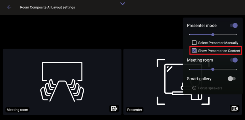 For non-supported cameras (e.g., RXVCam360), the Show Presenter on Content option is grayed out.