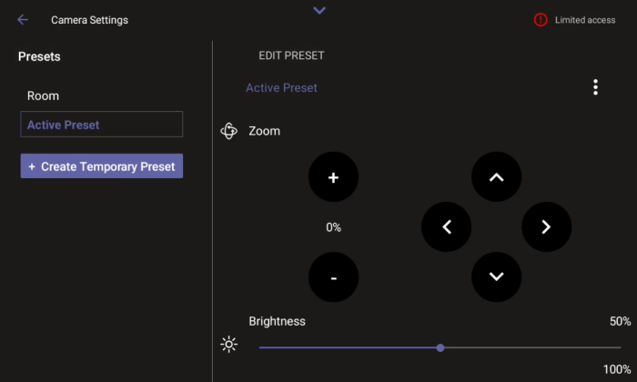 If you configure a preset (for example) to zoom in and focus on a whiteboard in the meeting room, users in a video call-meeting can switch to it and later switch back to the default ‘Room’ preset or any other defined preset. |