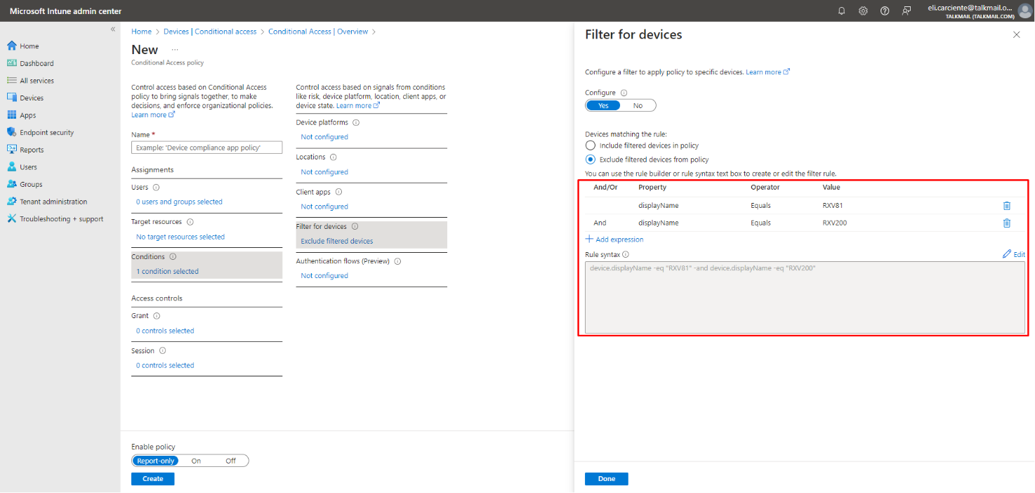 2. Exclude the device from Intune policies and replace displayName -contains RXVxx where RXVxx is the name of the device model (device.model).