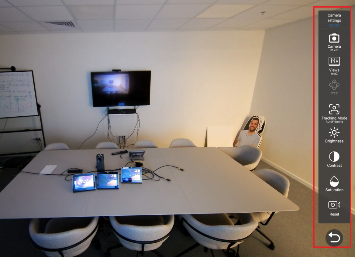 Change camera settings as required using the options on the vertical toolbar. Pan, Tilt, and Zoom (PTZ) can only be modified if 'Tracking Mode' is Manual. |