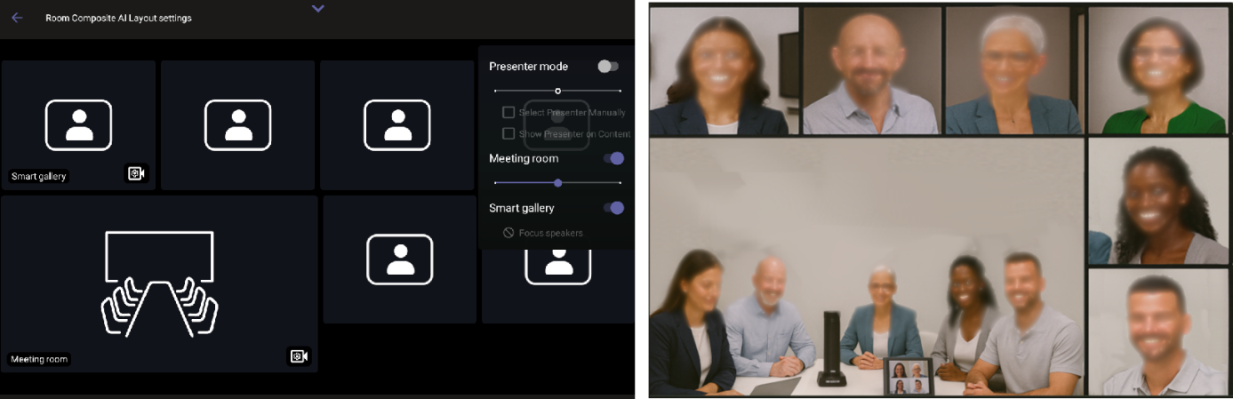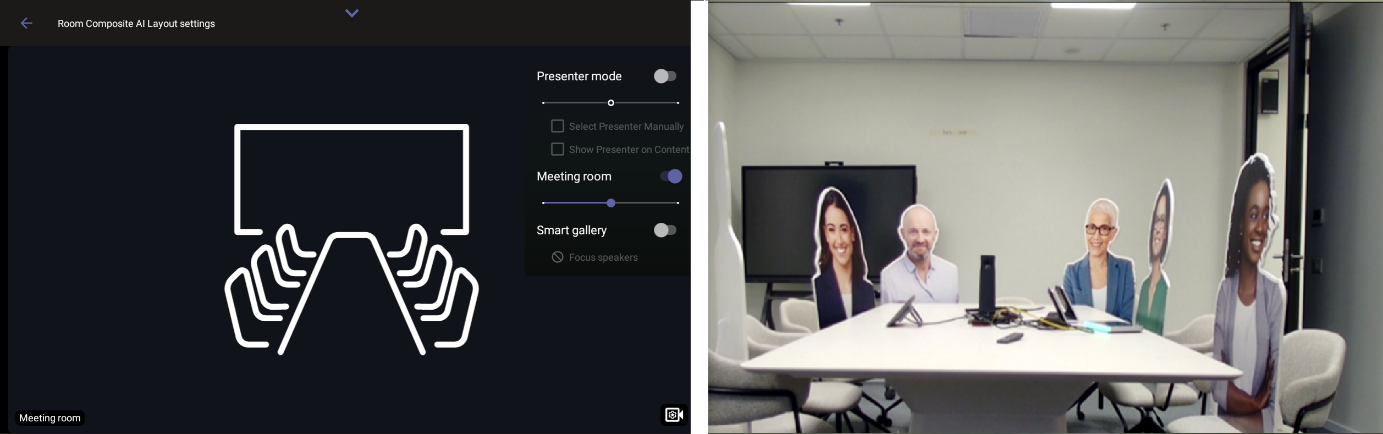 | 4. | Disabling Meeting room closes the wide-angle camera and centers the main camera feed in the screen. |