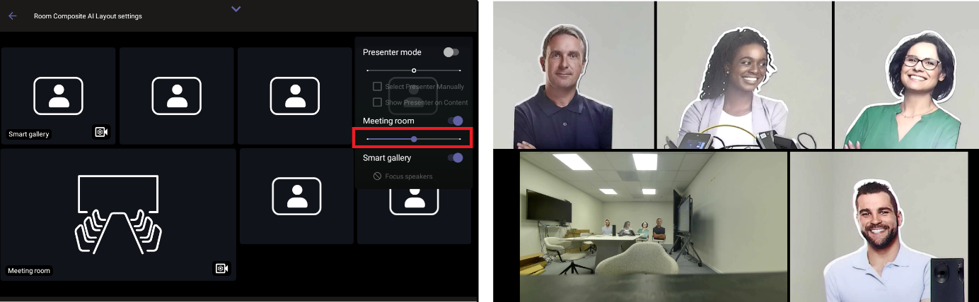 | 6. | Use the scaling bar shown in the following figure to control the ratio between the main camera size and the wide-angle camera size; move the slide bar to adjust the size of the Meeting room view accordingly. |