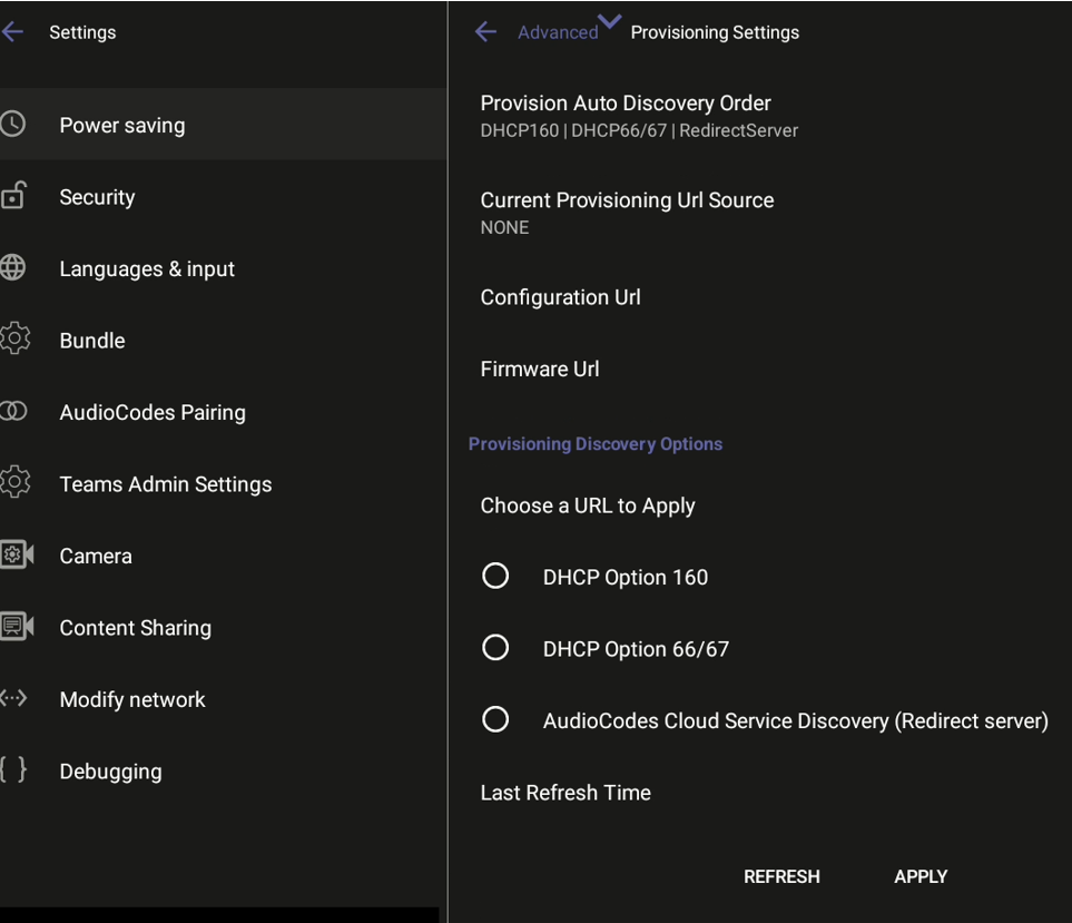 Select the desired discovery option for the device and click APPLY. After restarting, the device will use the selected option for provisioning. If no provisioning source is discovered, the system will use an alternate discovery option based on the Discovery Order setting. |
