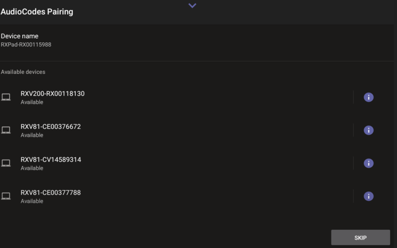 On the RX-PAD, select the requested language. The AudioCodes Pairing page is displayed, listing the available MTRAs: |